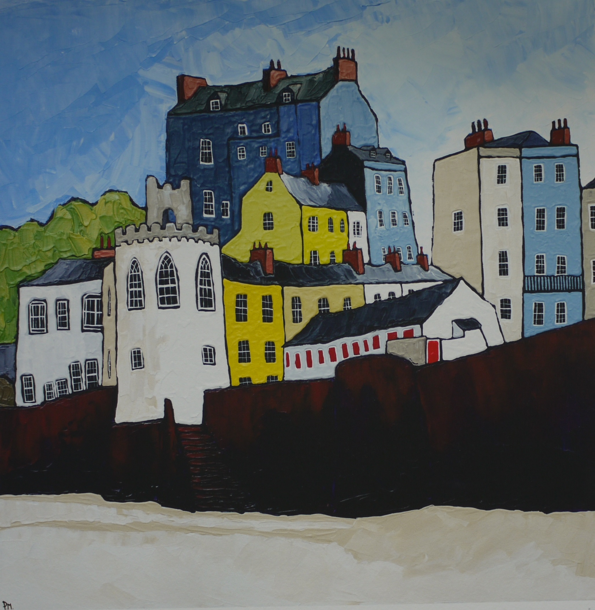 On low tide you can get some fantastic views of the Tenby Sea wall that defends the historic harbour from the high tide. The wall has protected the harbour and boats from storm damage for many years. The narrow cobbled streets above the sandy beaches are lined with shops, cafés and restaurants and has been a popular destination since the Victorian time, but the house with the best views has to be Laston House with panoramic views over North Beach. I have always wondered what the view would look like through those gothic style windows. I’d really love to paint that view.