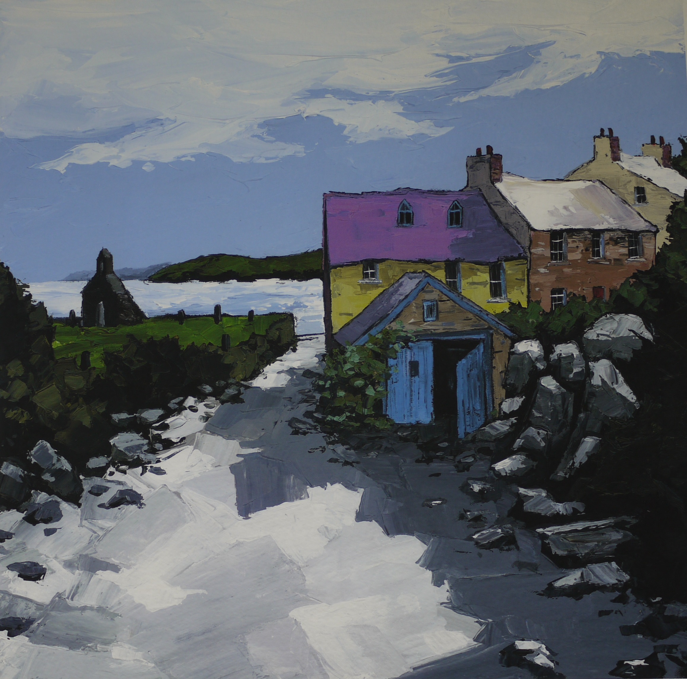Cwm yr Eglwys is set on the north coast of Pembrokeshire with sandy coves which provide plenty of rock pools for the explorer. This Village is very popular due to the location and history surrounding the area. Above the beach is the end wall of a chapel and the rest was washed away in the enormous storm of 1859. There is now a 10ft high wall providing protection to the remaining houses and to get down to the beach, you follow the slipway which narrows past some Fishermen’s Cottages. The shapes of these houses and the wooden shed really shone on this particular summer’s day. I really enjoyed mixing these colours to capture the warmth.